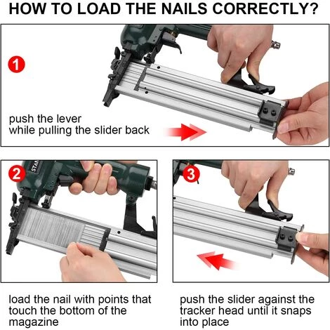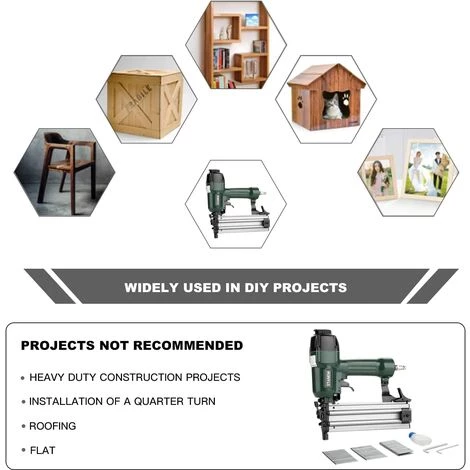 【Efficace】Equipé un magasin de grande capacité pouvant contenir jusqu’à 100 agrafes, la pression de travail est de 60-100PSI et la pression maximale est de 120PSI. Il est capable de clouer 2 à 4 fois par seconde, ce qui rend votre travail plus facile et plus efficace.