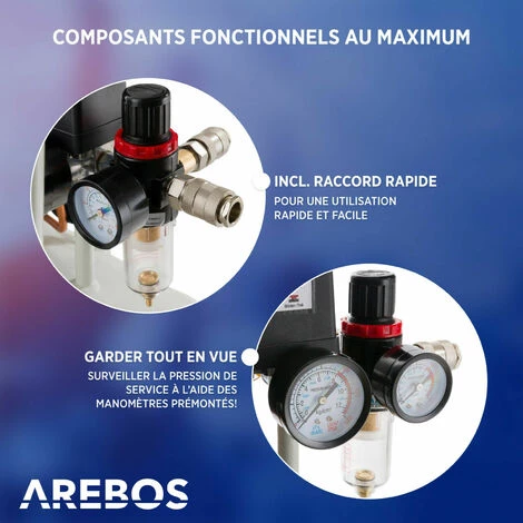 [Pratique] Le détendeur du compresseur d’air AREBOS ajuste la pression de service pour un fonctionnement optimisé. En même temps, les deux raccords rapides facilitent le remplacement rapide et facile des outils. Installation facile garantie à l’emplacement prévu !