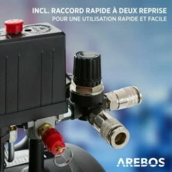 [Pratique] Le détendeur du compresseur d’air AREBOS ajuste la pression de service pour un fonctionnement optimisé. En même temps, les deux raccords rapides facilitent le remplacement rapide et facile des outils. Installation facile garantie à l’emplacement prévu !