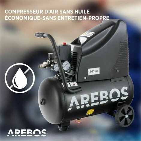 Le compresseur d’air AREBOS est doté d’une poignée caoutchoutée utile pour un transport pratique et facile. Les pieds en caoutchouc résistant aux vibrations assurent une installation antidérapante et un travail sûr.