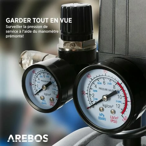 - Caractéristiques : sans huile, 2 manomètres, double coupleur rapide Euro, dispositif limiteur de pression