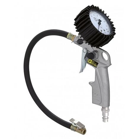 Pistolet de gonflage qui se branche sur une source d’air comprimé et qui permet de gonfler tous types de pneumatiques.Caractéristiques techniques :- Avec manomètre homologué, gradué de 0 à 10 bars, protégé par un caoutchouc anti-chocs- Longueur du tuyau de gonflage : 40 cm- Avec embout rapide pour valve standard, gâchette de gonflage et bouton pressoir pour le dégonflage.