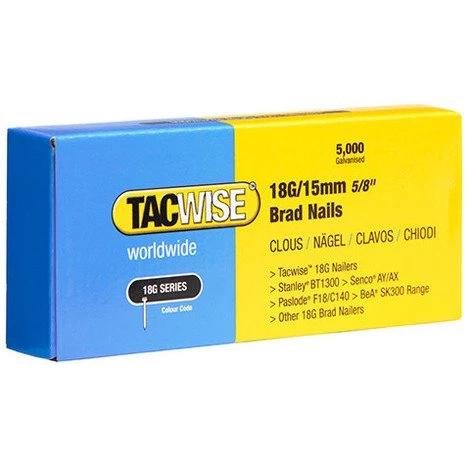 Boîte de 5000 clous de finition de type 18G L. 15 mm. Clous 18G professionnels pour les cloueurs pneumatiques et les tâches de clouage de gros volume. En acier galvanisé pour une meilleure durée de vie. Parfaitement adaptés aux applications de finition en bois. également utiles pour la thibaude, l’installation de magasin, l’installation des cuisine et d’autres applications de finition. Compatibles avec les cloueurs électriques et pneumatique Tacwise ainsi que beaucoup d’autres outils 18 GA.