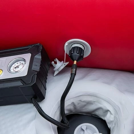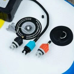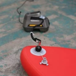 L’adaptateur de valve de gonflage vous permet de connecter n’importe quelle pompe électrique, pompe à pied ou compresseur standard au raccord de valve, qui est la valve standard pour les pneus de voiture et de vélo. <br>Il fonctionne avec la plupart des planches gonflables. Il convient également aux bateaux et kayaks qui sont également gonflés avec des valves Halkey-Roberts. Atteignez facilement 20 psi avec votre compresseur ou pompe à pneu. Veillez à ne pas trop gonfler votre planche ou votre embarcation et vérifiez fréquemment la pression de la planche. <br>Ce n’est qu’un adaptateur. La vitesse à laquelle la planche est gonflée dépend de la pompe utilisée. En raison du temps nécessaire pour gonfler le compresseur/pompe de pneu, il est recommandé de pomper la planche avec une pompe manuelle jusqu’à ce qu’elle soit difficile à gonfler, puis d’utiliser l’adaptateur pour terminer le gonflage. Gonflez en tournant la goupille centrale en position extérieure/fermée. Insérez l’adaptateur de valve dans la valve SUP de la même manière que l’embout du tuyau de la pompe.