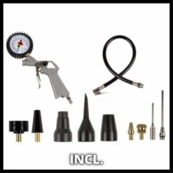- La livraison comprend un pistolet de soufflage, un gonfleur de pneu et un ensemble d’adaptateurs de 8 piĂšces, ainsi qu’un tuyau d’air comprimĂ© de 3 mĂštres avec raccord rapide.