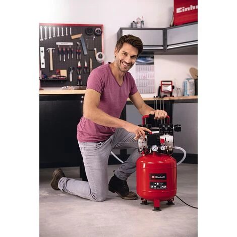 Le compresseur TE-AC 24 Silent est un appareil multifonctions pour les travaux dans le garage ou à l’atelier. Son faible niveau sonore de 57 dB (pression acoustique LpA) n’enlève rien à la puissance de ce compresseur, équipé d’un moteur 550 W. Il est beaucoup plus silencieux que les compresseurs concurrents de même puissance, et fonctionne avec un moteur sans huile et nécessitant peu de maintenance. Un robinet de vidange facilite l’entretien du compresseur. Avec son réservoir de 24 litres, le compresseur dispose de réserves d’air suffisantes pour pouvoir, une fois associé aux outils adéquats, appliquer laques et peintures ou huiler du bois en un tour de main, aussi bien sur de grandes surfaces que de manière ciblée. Il permet également de réaliser à l’atelier des opérations de soufflage ou de décapage au sable. Cet outil complet peut aussi être utilisé pour gonfler les pneus des voitures, des motos et des vélos, ainsi que des ballons ou des matelas pneumatiques.