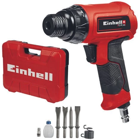 Le marteau burineur pneumatique TC-PC 45 Einhell est un outil puissant et résistant pour les travaux de rénovation et de démolition dans la maison et le jardin, sur pierre comme sur métal. Une poignée en caoutchouc antidérapante et ergonomique a été ajoutée pour un travail en toute sécurité. Avec une pression d’utilisation maximale de 6,3 bar, l’outil assure une fréquence de frappe allant jusqu’à 4 500 tr/min pour une force de frappe de max. 1,2 J.