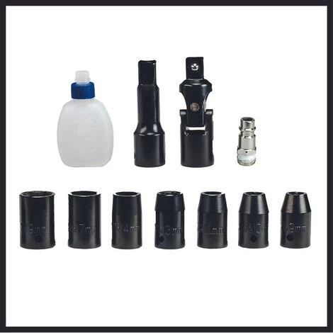 - Outre les 7 douilles de dimensions 9/10/11/13/14/17/19 mm, la visseuse-clé à chocs est vendue avec une rallonge, un joint universel, un raccord et une burette d’huile.