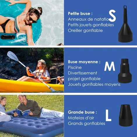 ă3 buses dĂ©tachables Ă choisiră Nous avons 3 buses de taille diffĂ©rente dans les pompes Ă air Ă©lectriques, elles peuvent s’adapter Ă la plupart des structures gonflables dont vous avez besoin pour gonfler ou dĂ©gonfler.