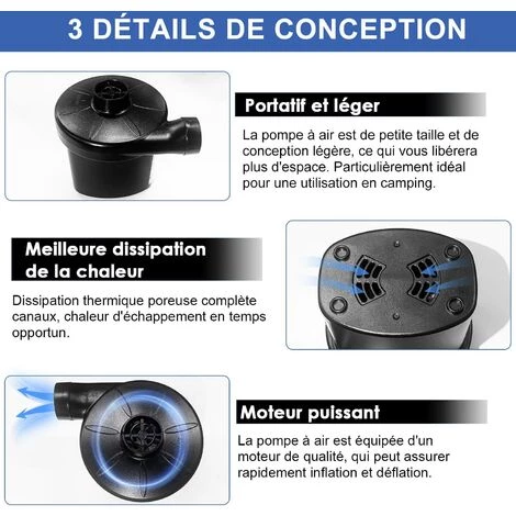 ăUtilisation polyvalenteă Notre gonfleur Ă air rapide convient Ă la plupart des types de produits aĂ©rĂ©s, tels que la pompe Ă matelas pneumatique, le lit pneumatique, la piscine, le bateau en radeau jouet, les meubles gonflables, l’anneau de natation et plus encore!