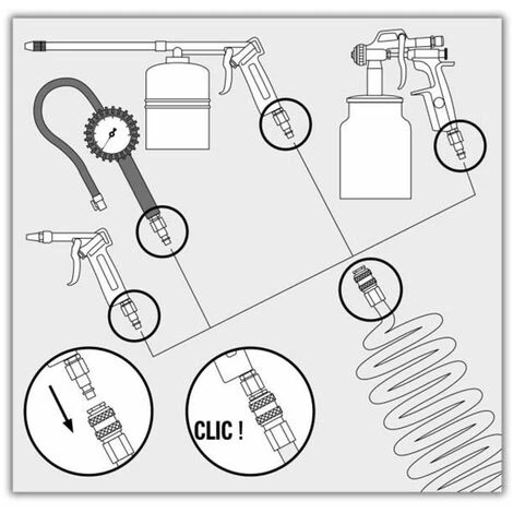 Kit de raccordement rapide pour air comprimĂ©, idĂ©al pour changer facilement d’outils sans avoir Ă dĂ©monter son installation.