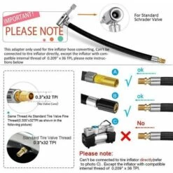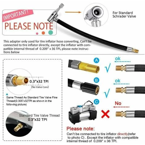MatĂ©riau de haute qualitĂ©: FabriquĂ© en plastique renforcĂ© de fibres, il est plus texturĂ©, rĂ©sistant et difficile Ă casser. Ladaptateur Ă vis en mĂ©tal a des dimensions prĂ©cises et une rĂ©duction de filetage plus Ă©levĂ©e.OpĂ©ration simple: Vissez lextrĂ©mitĂ© de ladaptateur sur le tuyau de gonflage dorigine, fixez la tĂȘte de ladaptateur sur la valve du pneu, dĂ©marrez le gonfleur pour un gonflage rapide et sans fuite.RĂ©sistance aux hautes pressions: Adoptez un tube extĂ©rieur tressĂ© rĂ©sistant aux hautes pressions qui est robuste et durable et peut supporter une pression jusquĂ 300 PSI. Cest mieux quun connecteur Ă visser ou Ă dĂ©visser pour quaucun air ne soit perdu lorsque le tuyau de gonflage est retirĂ©.Le forfait comprend: 1 x mandrin pneumatique de verrouillage.Larges applications: Notre tuyau de gonflage de pneus de voiture est trĂšs polyvalent et peut ĂȘtre connectĂ© directement Ă votre tuyau de pompe. Il est utilisĂ© non seulement pour gonfler les pneus de divers vĂ©los, motos, voitures, bus, camions, fauteuils roulants, mais Ă©galement pour connecter le gonfleur et le compresseur.Couleur : NoirPoids : 60gTaille : 20cm