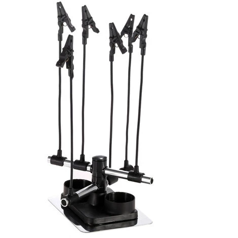 Chacun des six pinces crocodile est monté sur une colonne montante de fil flexible qui peut être positionné et repositionné selon les besoins.