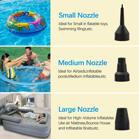 - 3 buses d’air: La pompe Ă air Ă©lectrique est Ă©quipĂ©e de 3 buses de diffĂ©rentes tailles. Vous pouvez choisir diffĂ©rentes buses en fonction de vos besoins. Le matelas de taille L peut gonfler le bateau gonflable, etc. La taille M est utilisĂ©e pour gonfler un petit lit, etc. La taille S est destinĂ©e aux petits jouets ou aux anneaux de bain gonflables.