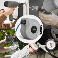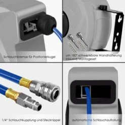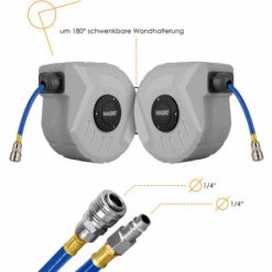 Qu’il s’agisse d’un atelier professionnel, d’un garage, d’un atelier de loisir, d’agriculture ou du jardin, avec l’enrouleur automatique de tuyau d’air comprimé MASKO, les travaux deviennent faciles. Avec nos tuyaux d’une longueur de 10 à 30 m, vous ne devrez plus jamais déplacer votre compresseur et aurez une portée suffisante pour travailler dans les conditions idéales. Grâce au support mural amovible, le dévidoir se monte facilement avec le kit de montage fourni et peut pivoter à 180°. Grâce à l’enrouleur automatique, le tuyau est enroulé rapidement et proprement après utilisation. L’avantage majeur de notre enrouleur de tuyau est qu’il est fermé. Grâce au modèle fermé, votre tuyau est protégé de la poussière et de la saleté, garantissant ainsi une durée de vie nettement plus longue de votre tuyau. De plus, étant donné que ce tuyau se réenroule tout seul, il n’y a aucun risque de trébucher ou de se blesser.