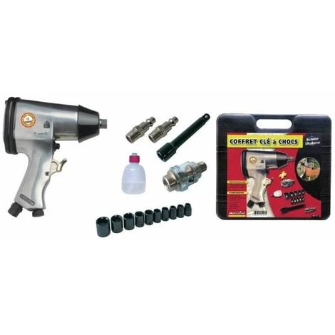 Kit complet clĂ© Ă chocs 1/2″ + 15 accessoires Pression 6 bars Consommation : 200 Litres/minute Sorties : 1/43″ Vitesse : 4600 tours / minute Poids total : 4.3 Kg Composition du kit : 1 clĂ© Ă choc 1/2″ 10 douilles (9, 10, 11, 13, 14, 17, 19, 22, 24, 27) 1 prolongateur 1 mini huileur 1 burette d’huile 2 inserts rapides 1 mallette de transport