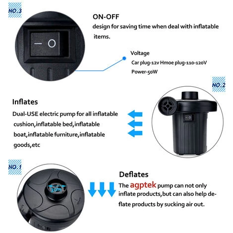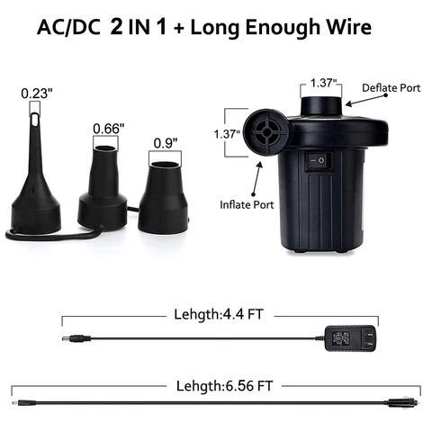 La pompe a air convient aux produits gonflables tels que lit pneumatique, lit flottant sur l’eau, canape gonflable, piscine gonflable, lit en coton, anneau de natation et tente exterieure.