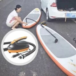 Filtre a sable integre pour l’admission d’air et le systeme de refroidissement de la pompe; Chambre de sortie integree pour reduire le bruit et ameliorer l’efficacite. Vanne a membrane unidirectionnelle pour proteger le gonfleur et maximiser la vitesse. Concu pour le bateau pneumatique, le SUP et le paddle board; Environ 10 minutes pour gonfler un SUP de 12 pieds ou un bateau gonflable de 9 pieds (3,5 PSI) avec un sol en tapis d’air (12 PSI) rapidement et facilement.