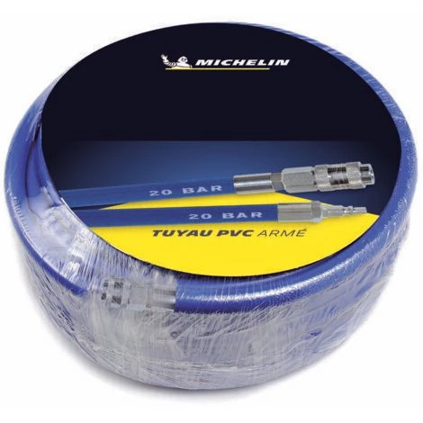 MICHELIN Flexible 20 mĂštres pour compresseur – Tuyau en PVC 20 mĂštres diamĂštre 10×17 mm Ă©quipĂ© en raccords rapides – Dimension emballĂ©: 32×10,5×32 cm – poids: 3kg – NORME CE