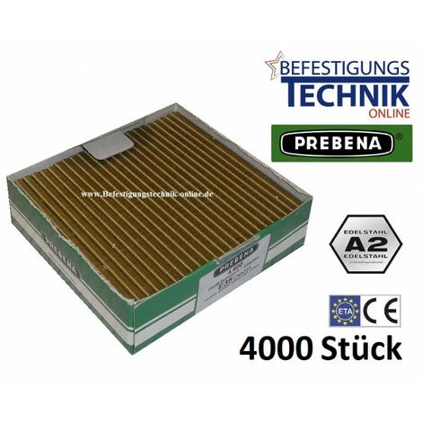Largeur du dos 5,65 mm Dimension intérieure 3,35 mm Dimension du fil 1,25×1,00 mm Agrafes / tige 100 pièces Version Pointe de burin, acier, inoxydable, résiné (C RF HZ) Exemples d’application Planches profilées,panneaux, panneaux d’aménagement intérieur, fonds de meubles et construction de bâtis Les agrafes PREBENA de type E en acier galvanisé répondent aux exigences de la norme DIN EN 13964:2007-02 (capacité de charge statique des éléments de plafonds suspendus). Contenu de l’emballage 4000 pièces