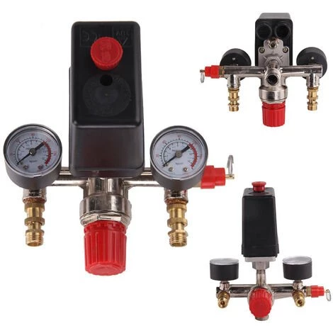 Vanne d’air de pressostat 230V, port en métal, durable et résistant à l’usure, tige à main lastics, facile à utiliser et à commuter, chaque port a un baromètre individuel, affiche en temps réel le changement de pression, sûr et facile à contrôler.