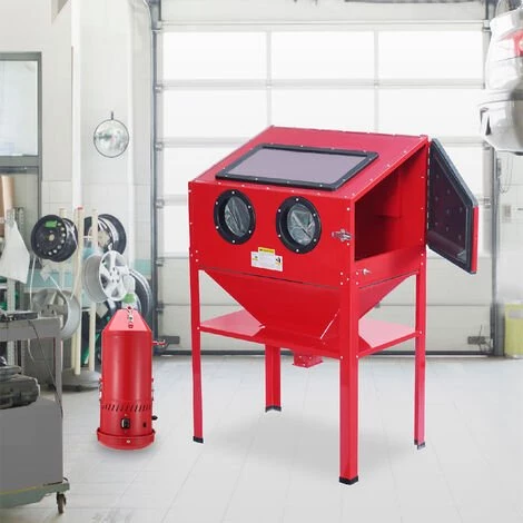 - Une cabine de sablage verticale d’une capacité de 220 litres avec une surface en acier revêtue de poudre, une fenêtre supérieure en plastique transparent et une porte latérale.