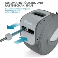 L’enrouleur automatique permet le dĂ©roulement du tuyau par simple traction avec arrĂȘt Ă n’importe quelle longueur. Suite Ă une traction Ă nouveau, il s’enroule Ă nouveau.