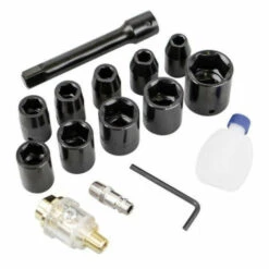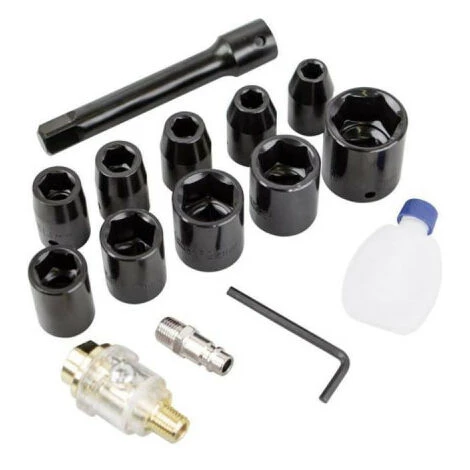 - L’ensemble comporte : 1 visseuse à choc, 10 douilles avec carré de ½ pouce (9 / 10 / 11 / 13 / 14 / 17/ 19 / 22 / 27 mm), 1 rallonge de 85 mm , un huileur et une burette d’huile.