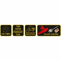 Le tuyau flexible est connecté à une pointe universelle pour permettre le pompage des soupapes de voiture et de vélo. Le manomÚtre est calibré à 7 bar.