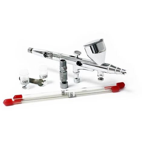 Cet aérographe professionnel ne s’adresse pas seulement aux utilisateurs professionnels. Le modèle est livré avec trois buses (d’un diamètre de 0,2 / 0,3 / 0,5mm) et convient donc aussi aux peintures ou laques aux pigments grossiers. Grâce à son godet d’une contenance de 9ml ce pistolet convient tout particulièrement travaux Airbrush de petite ou moyenne ampleur.Le réglage du mélange peinture/air se fait par la fonction de régulation double ou Double-Action. La quantité de passage de peinture peut être réglée par la vis au bout du manche. En plus la quantité de passage d’air se règle directement sous le godet à peinture.